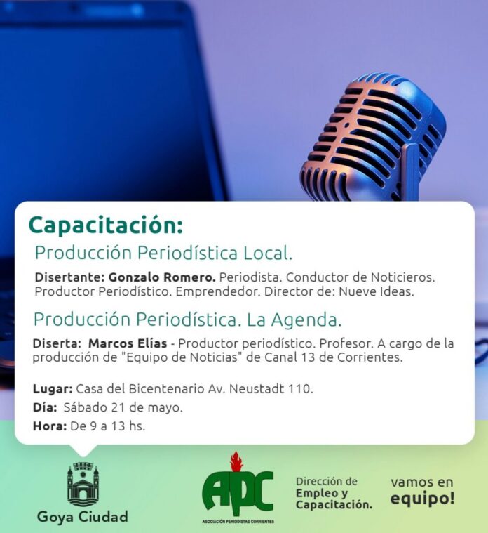Organizado por la Dirección de Empleo y Capacitación de la Municipalidad de Goya se realizará la Capacitación de Producción Periodística en Casa del Bicentenario este sábado 21 de mayo de 9 a 13 horas. Estarán disertando Gonzalo Romero y Marcos Elías de la ciudad de Corrientes.